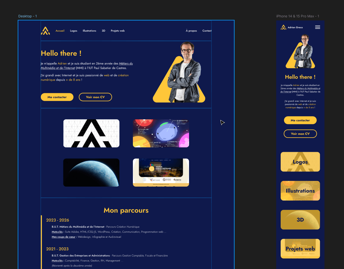 Le maquettage de ce portfolio a été conçu sur Figma. Chaque page possède une maquette en vue desktop (écran d’ordinateur) et une en vue mobile pour faciliter la mise en place responsive du site.
